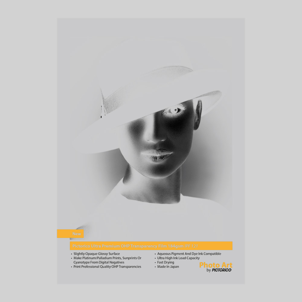 Die leicht opak-glänzende Oberfläche der Pictorico-Inkjetfilme, ist durch seine einzigartige Oberflächenbeschichtung (Crystal Coating) ideal, für die Herstellung von Fotonegativen aus digitalen Bilddaten (Edeldruckverfahren), oder als digitale Vergrößerung einer Analog-Fotografie. Pictorico Pro OHP Transparency Filme bieten eine hohe Tintenaufnahmekapazität für dichteste Schwarztöne. Der high-end Inkjetfilm IPF121 (TPS100) mit 25% mehr Tintenaufnahme, ist sowohl mit wasserbasierenden Pigment- als auch mit Farbstoff-Tinten (Dye-Inks) kompatibel. Die transluzierenden Oberfläche des Pictorico Pro OHP-Transparency Film eignet sich ebenso perfekt zum Drucken von Inkjet-Transparentfolien im Rahmen einer Siebdruckfilm- bzw. Reprofilm-Herstellung.